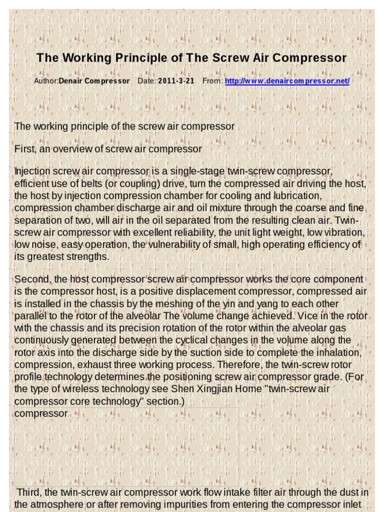 China Screw Compressor Working Principle Pdf Manufacture Visit Here to Find the Screw Compressor Working Principle Pdf That You are Searching for. The rotary screw air compressor has become popular source of compressed air for industrial applications. Air compressor is a device that that increases the pressure of a gas by reducing its volume and converts.